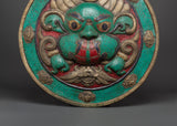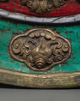 This stunning Tibetan wall hanging with turquoise, a handcrafted sacred decoration with gorgeous turquoise and coral inlays on a silver-plated copper body, will elevate your spiritual surroundings. The Lion, a timeless symbol of bravery, knowledge, and protection in Tibetan culture, is powerfully depicted in this artwork. This wall hanging is both a beautiful work of Himalayan art and a spiritual shield due to its striking gaze and intricate workmanship.