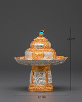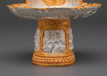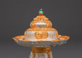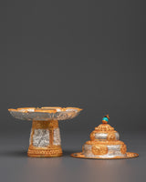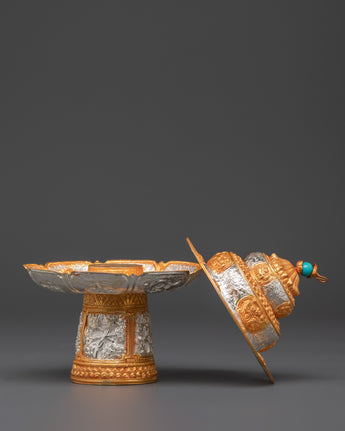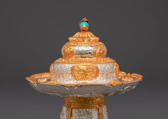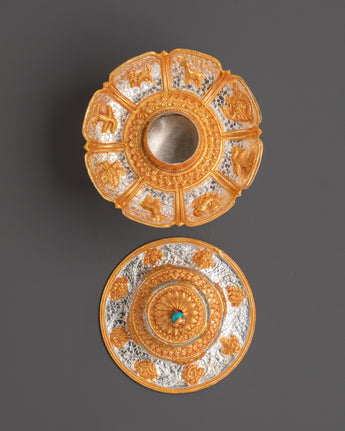 This Tibetan tea cup, crafted from white metal, embodies Tibet's traditional artistry while also combining Useful and spiritual significance. The electro-gold and silver plating adds a luxurious touch while also enhancing the piece's spiritual aura. The turquoise stone, often regarded as a symbol of wisdom and protection, enhances the cup's spiritual significance. This finely crafted item is ideal for anyone looking to add a touch of Tibetan culture to their collection or as a thoughtful gift. Allow this lovely teacup to bring harmony, balance, and energy into your home or spiritual place.