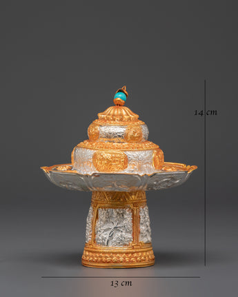 Discover the magnificence of this handcrafted Tibetan white metal tea cup, intended to enhance your spiritual and ceremonial experiences. This unique teacup, measuring 14cm in height and 13cm in diameter, has been precisely plated with both electro-gold and electro-silver, demonstrating excellent artistry. Its complex workmanship is complemented by a magnificent fake turquoise stone at the top, making it not only useful but also a lovely ornamental element for any collection. Whether used for tea ceremonies, meditation, or as part of your Tibetan decor, this tea cup exemplifies spiritual beauty and cultural richness.