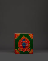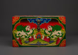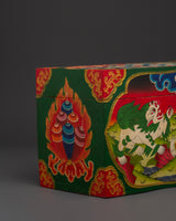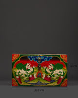 The rear of the box features a magnificent Endless Knot, symbolizing perpetual harmony and the interconnection of wisdom and compassion. This box embodies traditional Tibetan artistry, infused with spiritual significance and purpose, and is suitable for ceremonial use or to enhance your sacred space.