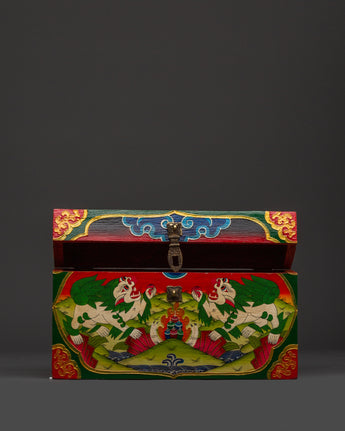 This exquisite Tibetan wooden box featuring snow lions represents a vivid combination of cultural symbolism and spiritual purpose. The front features two hand-painted snow lions in vibrant acrylic colors, representing joy, protection, and fearlessness, as they guard sacred treasures within a mystical, cloud-laden landscape. A traditional Tibetan flame offering is positioned above them, adding a layer of ritual significance.