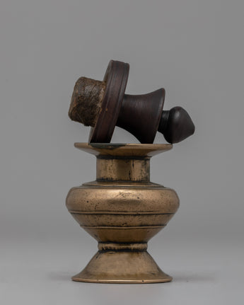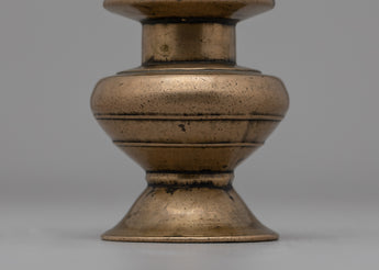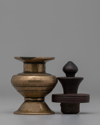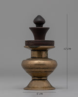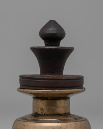 This Traditional Tibetan Inkpot is a stunningly constructed item with a bronze body and a wooden cap, representing both useful and artistic skill. This inkpot, measuring 12 cm in height and 6 cm in breadth, is more substantial than normal portable models, indicating that it was intended for more conspicuous or ceremonial use. Its strong bronze substance represents durability and strength, traits that have made bronze a highly valued commodity throughout history. The wooden cap with a dome-shaped knob serves as a useful tool for protecting the ink, keeping it secure and avoiding evaporation. The wooden cap's design gives an attractive touch, naturally contrasting with the metal and highlighting the balance of strength and nature.
