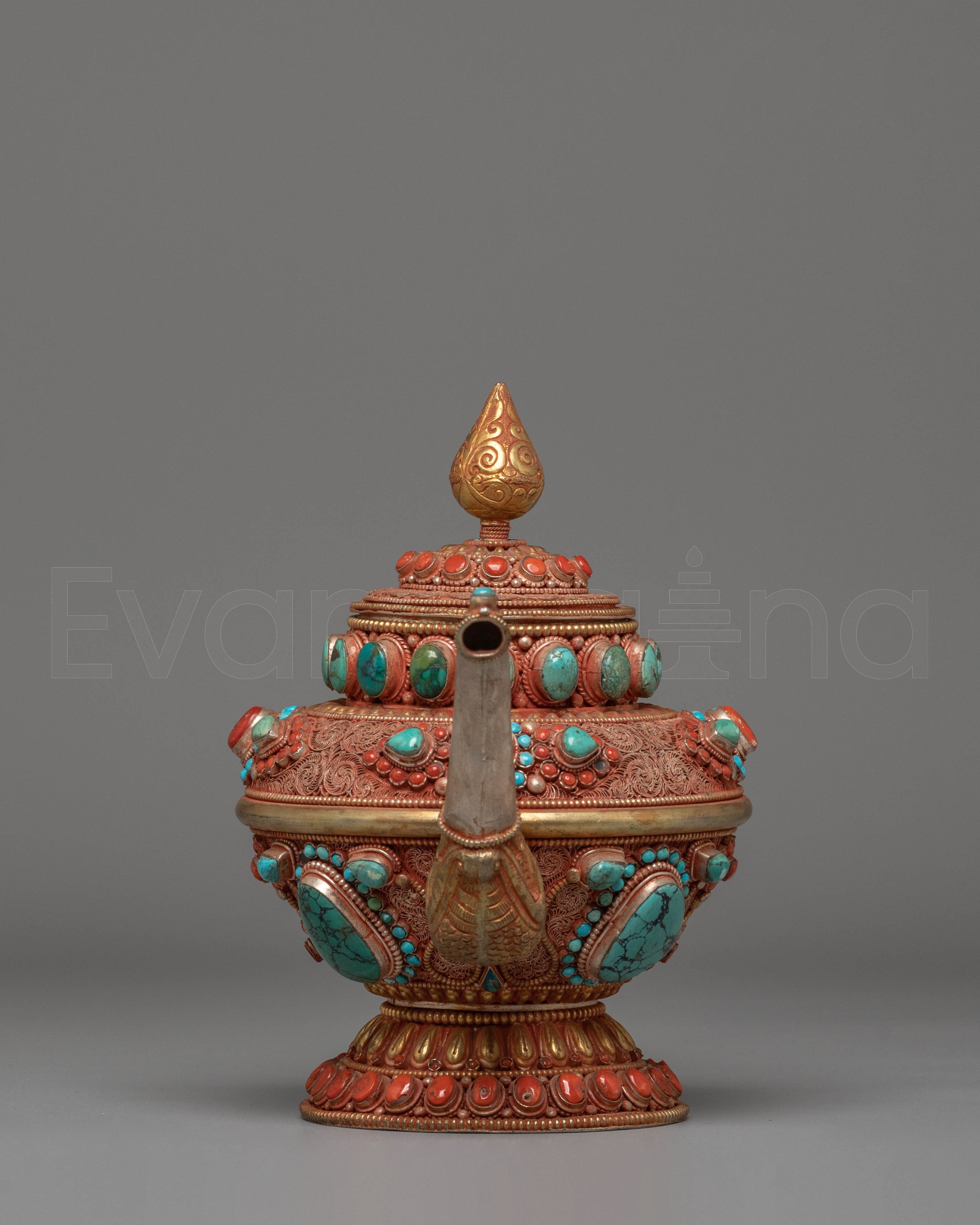 The pot features an extraordinary combination of repoussé patterns, intricate filigree work, and hand-set stones that reflect Tibetan symbolism and artistic mastery. The vibrant coral stones signify protection and vitality, while the turquoise represents healing, purification, and spiritual clarity. The wide, sculpted spout, lotus-inspired base, and dome-shaped lid crowned with a flame-like finial all add to its regal design. Every carved swirl, floral motif, and metal border showcases the depth of traditional Tibetan aesthetics.
