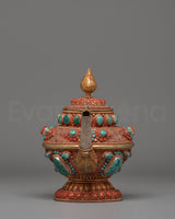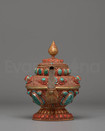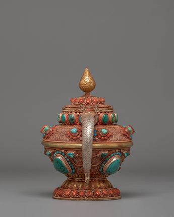 This Traditional Tibetan Tea Pot for Decor is a masterpiece of Himalayan artistry, skillfully handcrafted from a copper body, embellished with silver components and fire-gold plating, with colorful coral and blue stones. With measurements of 23 cm in height and 32 cm in breadth, and a hefty weight of 1.88 kg, this statement piece is perfect for religious displays and cultural interiors.