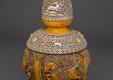 The craftsmanship exemplifies genuine Tibetan creativity, with each element carefully applied to represent harmony and wealth, from the silver plating to the bright stones. The amber tint adds warmth and energy, making it excellent for meditation or embellishing your living space. Enhance your spiritual decor with this Traditional Tibetan Vase, a symbol of Himalayan culture and artistry that adds beauty and great energy to your environment.