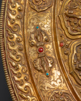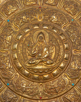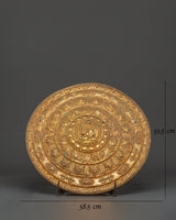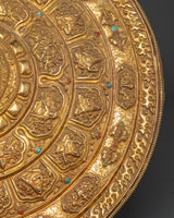 Crafted by expert artisans, this gold-plated mandala displays the traditional Tibetan art of delicate work, in which every detail is precisely carved to reflect sacred Buddhist symbols and patterns. The primary figure of Tsongkhapa is surrounded by beautiful patterns, symbolizing the spiritual path and yearning for enlightenment. The stand enhances the mandala's elegance, displaying it on altars, tables, or sacred areas. This Buddhist ceremonial plate serves as a tool for meditation, spiritual focus, and ritual activities, and is a gorgeous piece. Its brilliant golden finish and meticulously crafted designs honor Tibetan Buddhism's rich past.