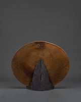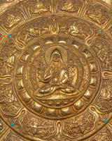 The Tsongkhapa Mandala with Stand is a stunning work of spiritual art that portrays the profound teachings and blessings of Tsongkhapa, the famed Tibetan Buddhist scholar and founder of the Gelug order. Standing 33.5 cm tall and 38.5 cm wide, this mandala has a finely constructed gold-plated copper body that radiates a brilliant and mystical presence. This handcrafted mandala weighs around 1.88 kg and is intended to be displayed on a stand, making it an ideal complement to any meditation room, Buddhist altar, or spiritual décor setting. The mandala plate's clear design is visually appealing and highly meaningful, embodying Tsongkhapa's wisdom, compassion, and enlightenment essence.