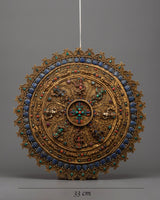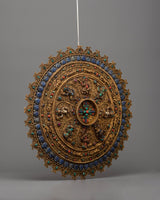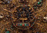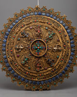 This mandala is adorned with precisely inlaid lapis, turquoise, and coral stones, all of which add a dazzling display of colors and energy. These priceless stones combine with the mandala's golden luster to create a visually arresting piece that exudes artistic elegance and symbolic meaning.