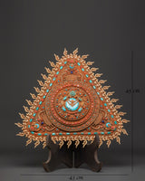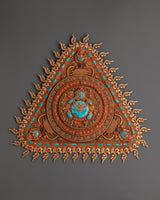 This exquisite Vajrayogini Symbol Wall Hanging is skillfully handcrafted in the Himalayan style. This triangle mandala panel, which measures 45cm in height and 43cm in width, is made of copper and plated in beautiful gold and silver. The design revolves around Vajrayogini's symbolic presence, which exudes power, wisdom, and liberation, making it an ideal focal point for meditation rooms, altars, or spiritual sanctuaries.