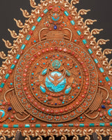 The delicate workmanship is further accentuated by imitation coral and turquoise inlays, representing life force energy and spiritual clarity. Weighing 2.81kg, this artwork has both visual impact and spiritual gravity. Each flame-like motif surrounding the mandala emphasizes its position as a potent spiritual gateway. At the same time, the rich texture and craftsmanship represent the sacred shape and ritual symbolism important to Vajrayana Buddhist art.