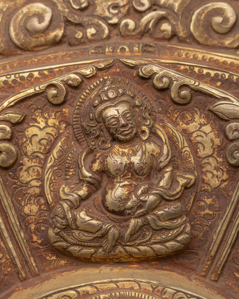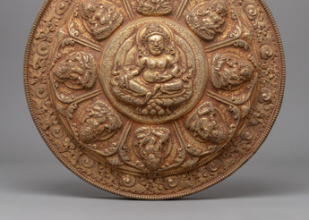 This gorgeous Mandala Wall Hanging Home Decor features a mandala with a copper body and rich gold plating. With a height of 30 cm, a width of 29 cm, and a weight of 1.188 kg, it commands attention in any setting. This intricately crafted mandala is centered on a powerful representation of the deity Dzambhala, connected with wealth and prosperity in Tibetan Buddhism. Dzambhala is shown with a wrathful countenance, indicating his protective and plentiful character. His right-hand holds a citron fruit, representing wealth and success, and his left-hand holds a mongoose, representing the exchange of treasures.