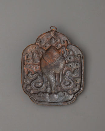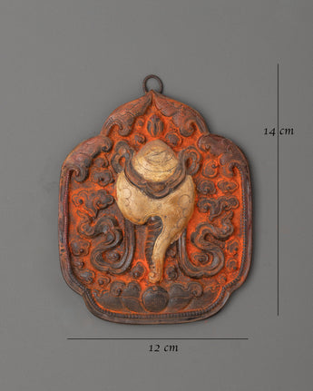 This hand-carved White Conch Shell wall hanging is crafted from copper and symbolizes the sacred sound of the Dharma. In Tibetan Buddhism, the conch shell has historically been associated with the proclamation of the Buddha's teachings, signifying spiritual enlightenment and the removal of obstacles. With a height of 14 cm and a breadth of 12 cm, it serves as a perfect addition to any spiritual altar, meditation space, or home decor.