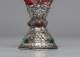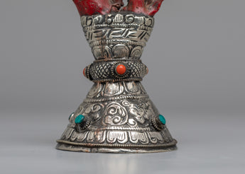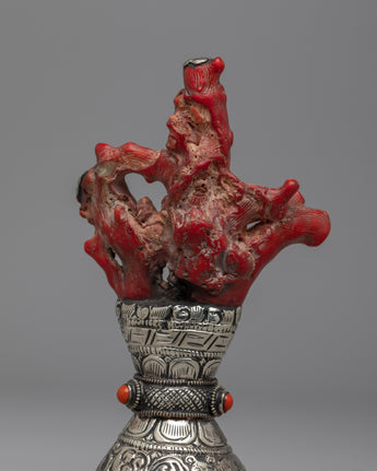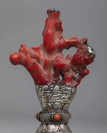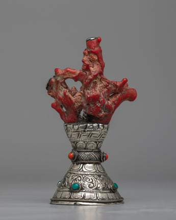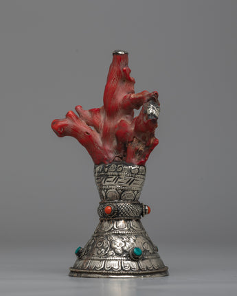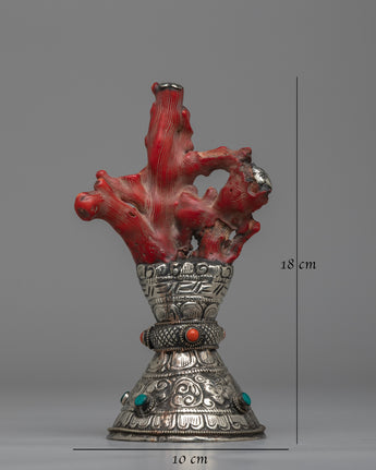 See the White Metal Stamp, a symbol of precise craftsmanship and everlasting elegance. Handmade with care on a body of white metal, this stunning sculpture is 18cm tall and commands attention with its understated elegance. A coral coral rests above the stamp, providing color and character to the design. Delicately inlaid emitted stones add to its aesthetic appeal, producing a celestial glow that catches the eye and stirs the soul.