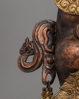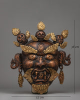 The Wrathful Copper Bhairav Mask is an elaborate handcrafted item made of copper with brass inlays. It is 38 cm in height and 32 cm in breadth and weighs 0.68 kg, making it large. The vividly detailed design depicts the frightening Bhairav with a furious look, exaggerated features, and flames releasing from his head, representing destruction and protection in the tantric tradition.