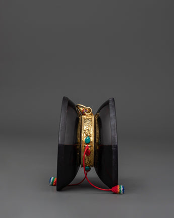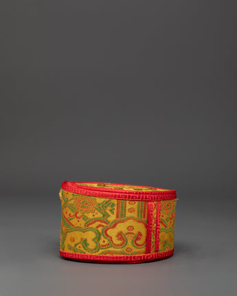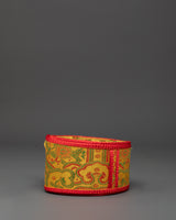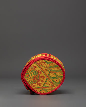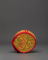 This damaru features a gold-plated copper body inlaid with brilliant artificial turquoise and coral stones, which represent spiritual purity and compassion. With a width of 11.5cm and a height of 8cm, it weighs 0.21kg and fits comfortably in the hand for ceremonial usage. The drum comes with a yellow and red brocade case with auspicious Tibetan motifs that not only protects the instrument but also enhances its religious appearance.