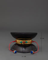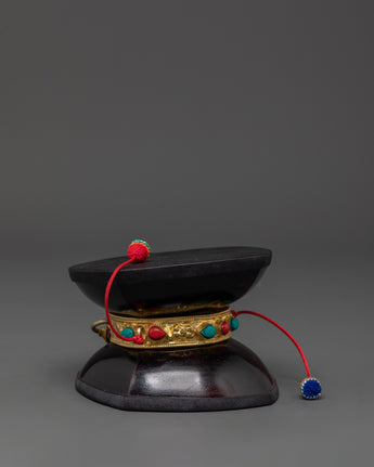 The Acacia Wood Damaru is a sacred Tibetan ritual drum used for meditation and ceremonial purposes. This damaru is carefully crafted from acacia wood and features a polished black finish that accentuates its beauty and resonance. It produces a sharp, rhythmic sound that is ideal for summoning deities, removing negativity, and enhancing meditative focus in Vajrayana practice.