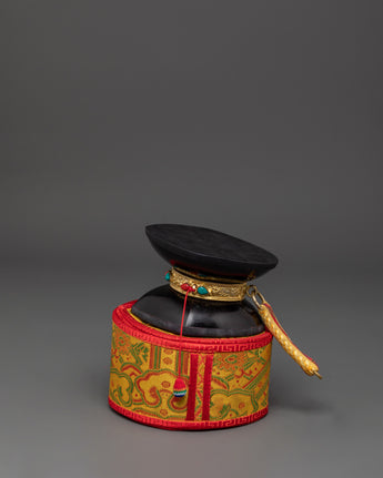 A Chod drum, integral to the Chod spiritual practice in Tibetan Buddhism, is a unique and symbolic instrument. Also known as a damaru, this small, double-sided hand drum features a narrow waist that connects two drumheads. The drum's shape is often likened to that of an hourglass, embodying the union of wisdom and compassion. Used by Chod practitioners during ritualistic ceremonies, the drum's rhythmic beating is believed to connect with the sacred energies, facilitating meditation and the realization of emptiness. The Chod drum, with its ritualistic role, underscores the synthesis of sound, spirituality, and meditation in Tibetan Buddhist traditions.