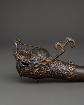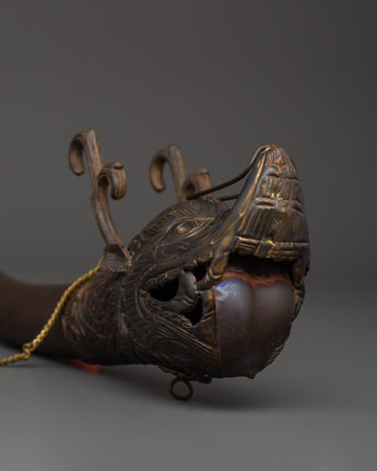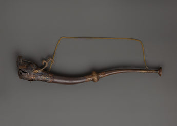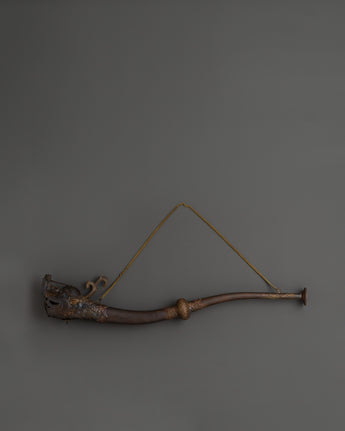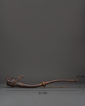 With this Antique-Finish Brass Kangling, a sacred trumpet used in profound tantric practices like Chöd, you can embrace the potent resonance of Tibetan ritual. This ceremonial horn, measuring 51 cm in length and featuring an antique finish, is used in profound spiritual ceremonies to summon protective deities and symbolize the severing of individuality. The handcrafted service, featuring an opening and dragon-head base, contributes to its magical and artistic appeal.
