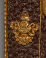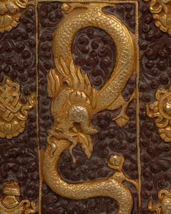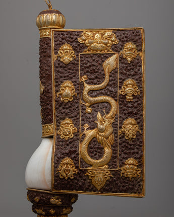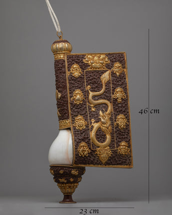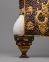 Accept the heavenly blessings of the Buddhist Auspicious Sankha, which is painstakingly created by hand on a copper body, plated in a brilliant gold and copper, and dragon carved. Measuring an enormous 46 cm in height and 23 cm in width, this auspicious symbol of enlightenment and purity weighs 2.21 kg.