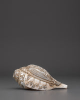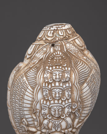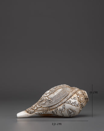 This stunning hand-carved Avalokiteshvara Conch Shell represents compassion and spiritual enlightenment. Standing 9cm tall and 19cm wide, this lovely sculpture weighs 0.56kg and acts as both a decorative artifact and a utilitarian ritual tool. The conch shell, which is commonly used in Tibetan Buddhist rites, is intricately carved with the figure of Avalokiteshvara, the Bodhisattva of Compassion. Avalokiteshvara is recognized for his ability to listen to the suffering of creatures and deliver counsel; therefore, this item serves as a powerful spiritual reminder. Its elaborate design and religious meaning make it an excellent choice for any meditation place or altar.