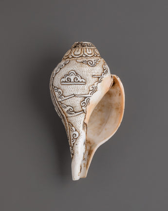 In Buddhist worship, the conch shell is used as a trumpet or offertory receptacle and represents Buddha's spoken voice. It is one of the eight auspicious Buddhist symbols, reflecting the victory of the Buddha's teachings, which spread omnidirectionally like the sound of a conch shell. The conch shell is a symbol of power, authority, and sovereignty; its sound is believed to ward off evil spirits, prevent natural disasters, and deter dangerous creatures.