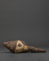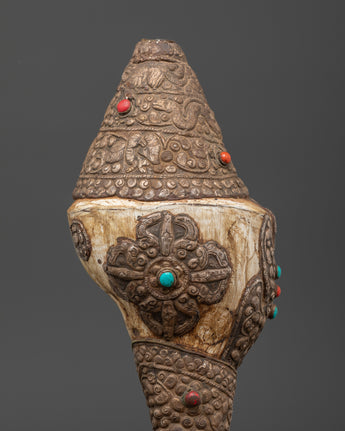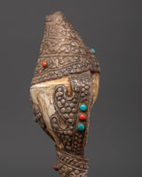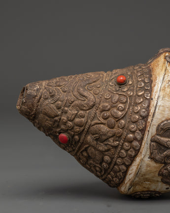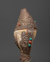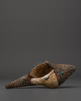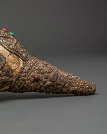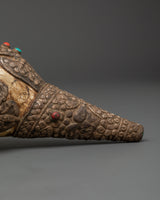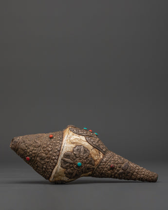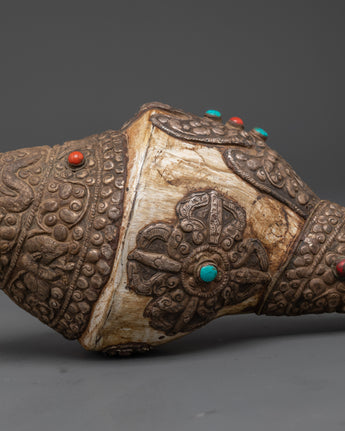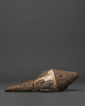 Buddhist Copper Conch Shell | Tibetan Ritual Trumpet with Coral and Turquoise