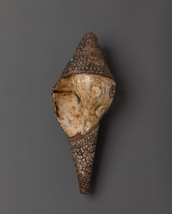 This Buddhist Copper Conch Shell, also known as a Dung Dkar, is a sacred ritual trumpet used during Tibetan Buddhist ceremonies. It has traditionally been used in pujas, temple offerings, and altar rituals to purify space and invoke blessings, representing the sound of the Dharma spreading in all directions.