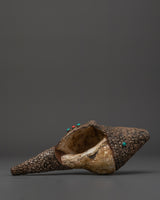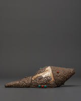It is crafted from a natural conch shell and is encased in intricately engraved copper, featuring decorative inlays of artificial coral and turquoise that represent protection and spiritual clarity. This ceremonial shell, measuring 11.5 cm in height, 30 cm in width, and weighing 0.91 kg, is both spiritually powerful and visually striking.