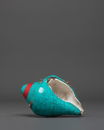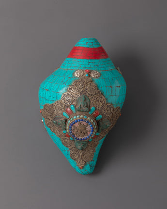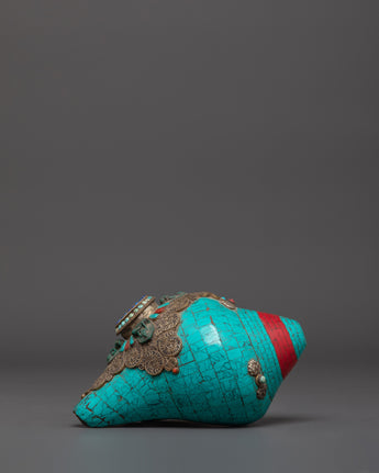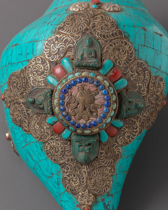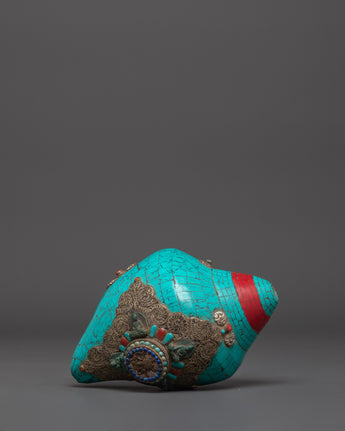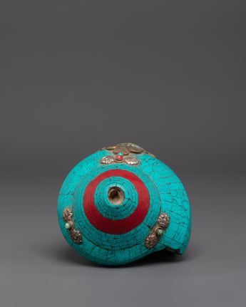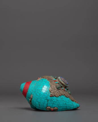 Tibetan Buddhist Handmade Turquoise Conch | Conch Shell with Coral & Turquoise Stones