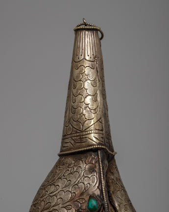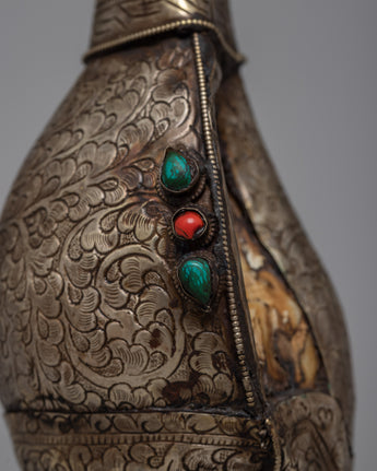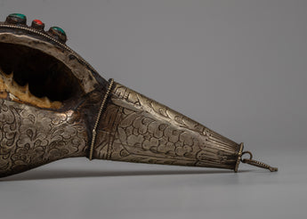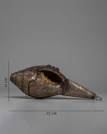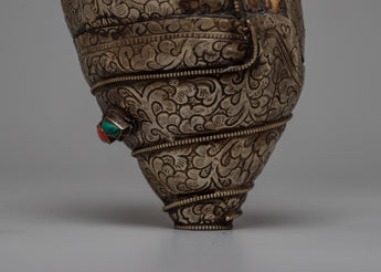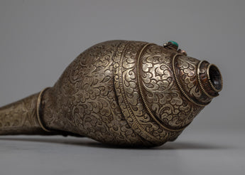 A holy object carefully made from conch shell and white metal, the Buddhist Ritual Conch Shell is a representation of spirituality and purity. This exquisitely crafted conch shell, used in ceremonies and spiritual practices, represents the core of Buddhist customs and ceremonies.