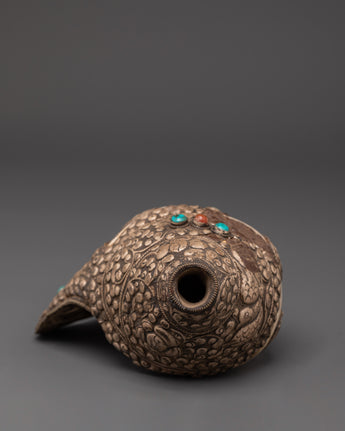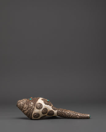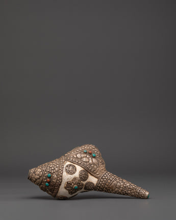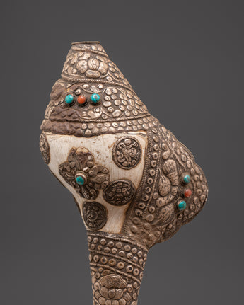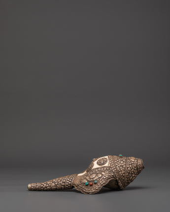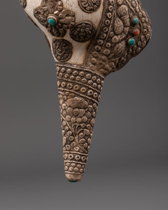 Buddhist Ritual Conch with White Metal | Turquoise and Coral Stones Inlaid
