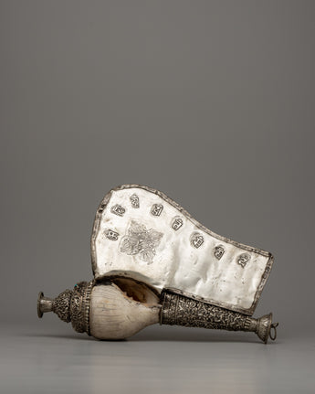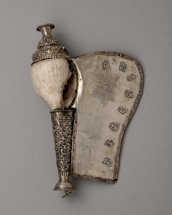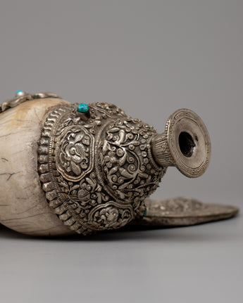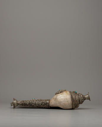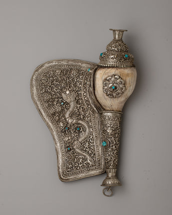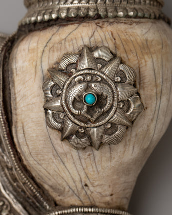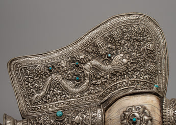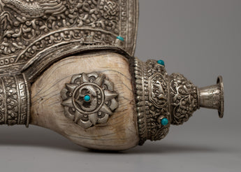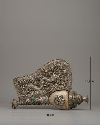 With a combination of workmanship and talent, the Carved Conch Shell emerges as a symbol of timeless beauty. Its copper body, adorned with a silver-plated finish, exudes understated beauty, while the detailed carving of a dragon gives a sense of mysticism and power. Turquoise stones, adorn its surface, giving it a celestial atmosphere that captivates the eye and stirs the soul.