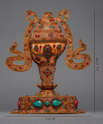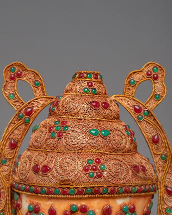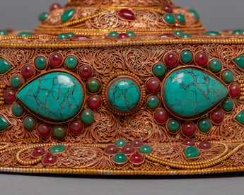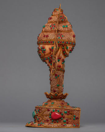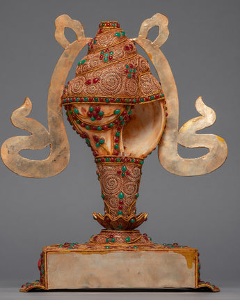 The Conch Shell has a stand that is Handmade with a copper body and 24k gold plating, this lovely conch shell has a gleaming and regal appearance. The shell's embedded gemstones provide a touch of class, beauty, and spiritual significance. T The Tibetan Diz beads are embedded. The conch shell's circular blowing mechanism is especially significant because it symbolizes both the boundless nature of the universe and the never-ending cycle of birth, death, and rebirth