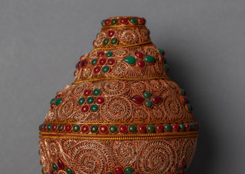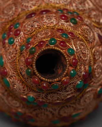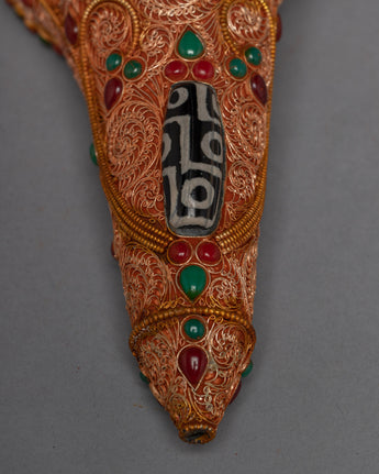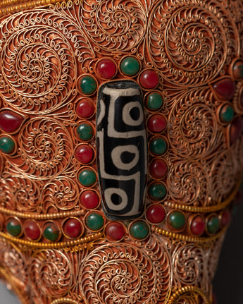 This magnificent piece is handcrafted on a copper body and then plated with 24k gold for a kingly and luxurious appearance. The gemstones are embedded into the piece to add beauty and elegance, and the addition of dzi beads enhances the piece's spiritual significance. Dzi beads are believed to have protective and healing properties in Tibetan culture and are frequently worn as a form of spiritual adornment. This piece's gemstones and dzi beads combine to form a powerful symbol of protection, healing, and spiritual connection.