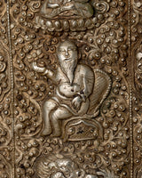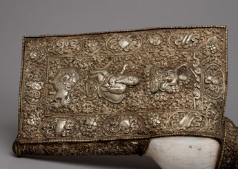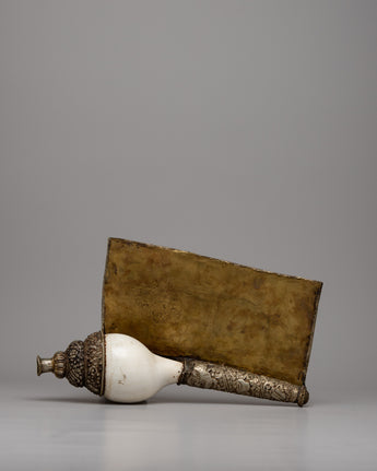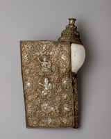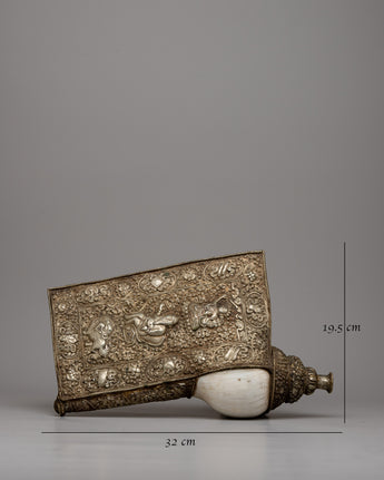 The Conch Shell Trumpet, handcrafted with devotion and skill, exudes magnificent artistry on its silver-plated copper body. Each curve and contour demonstrates the mastery of its construction, inspiring adoration and amazement. Delicate carvings of respected deities and auspicious symbols decorate its surface, with each detail carefully engraved to represent timeless wisdom and celestial grace. As it is elevated, the trumpet transforms into a conduit for spiritual resonance, its ethereal melody resonating across dimensions, summoning the sacred essence of life.