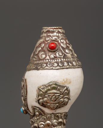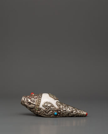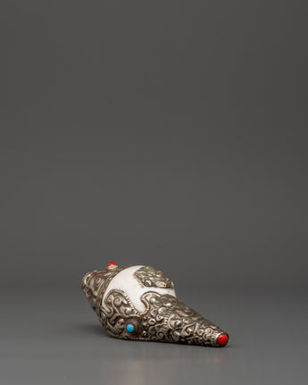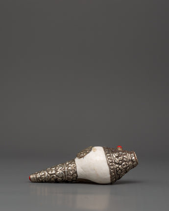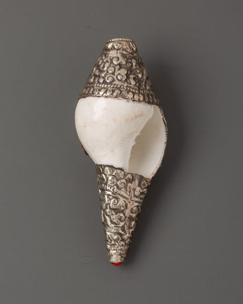 The pattern enhances the conch shell, which is naturally associated with spiritual practices. The turquoise denotes wisdom and tranquillity, while the coral indicates energy and protection. With its delicate silver work, the overall aesthetic gives elegance and a spiritual touch to any place, making it an excellent choice for your meditation or prayer area.