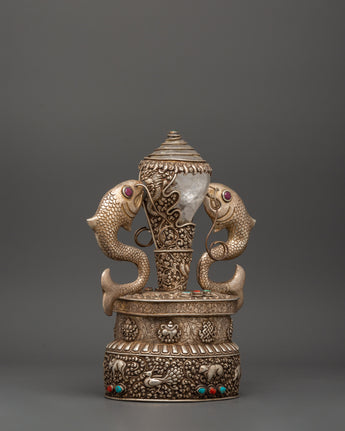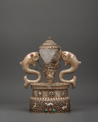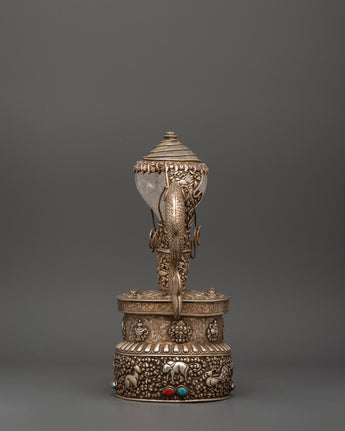 Conch with Auspicious Symbols | Handcrafted Silver & Crystal Tibetan Ritual Item