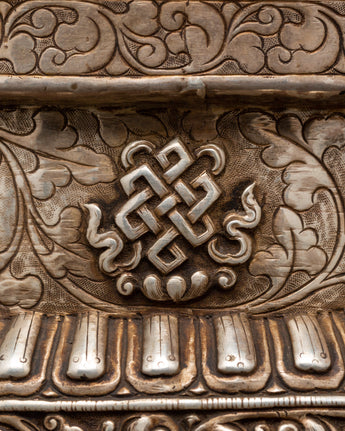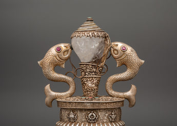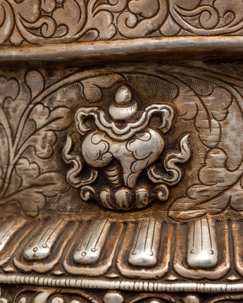 This Conch with Auspicious Symbols is a remarkable example of Tibetan craftsmanship made from crystal and pure silver. Measuring 28 cm tall and 23 cm wide, and weighing 3.31 kg, it serves as the perfect spiritual centerpiece for any altar or meditation space. The combination of coral and turquoise stones creates a stunning and soothing impression, while the floral designs and auspicious symbols etched into the base add spiritual significance. This conch is a beautiful object and a representation of Tibetan culture and philosophy.