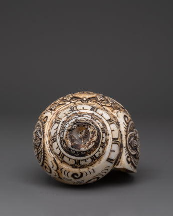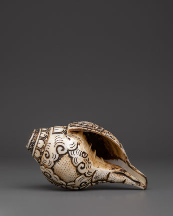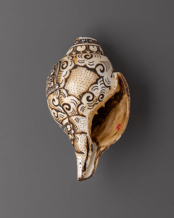 In Tibetan Buddhist tradition, the conch shell is a significant ritual artifact that represents the proclamation of truth and the propagation of Dharma across the world. The picture of Guru Rinpoche carved on this conch is particularly regarded for bestowing wisdom, spiritual power, and direction upon practitioners. The engraving's skill and intricacy make this item an excellent addition to any altar or meditation room, and it has great symbolic resonance for those who practice Tibetan Buddhism.