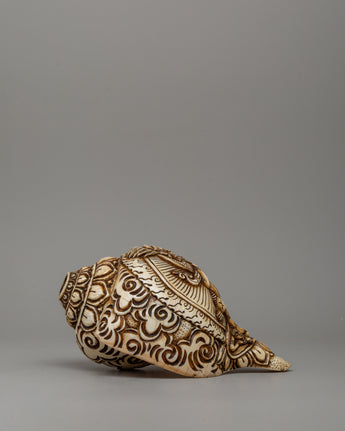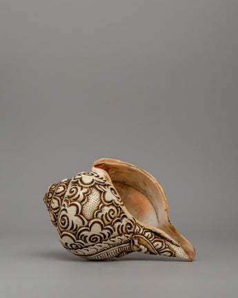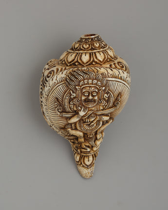 This conch shell with Shakya Mahakala carvings stands 10 cm in height and 19 cm in width—a fierce protector deity in Tibetan Buddhism. The deity is intricately etched into the shell, depicting Mahakala with his wrathful expression, symbolizing the destruction of obstacles and opposing forces. The level of detail in the carving highlights Mahakala's powerful presence, emphasizing his role as a guardian against inner and outer afflictions. The floral carvings on the shell further enhance the piece's overall aesthetic, adding layers of symbolism related to purity and spiritual growth.