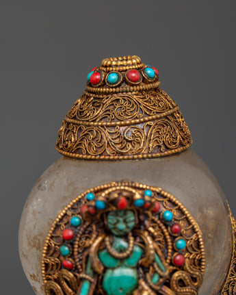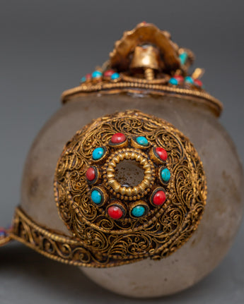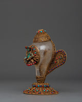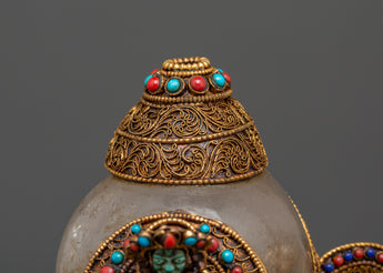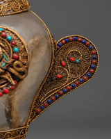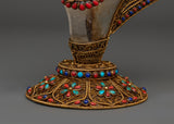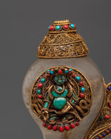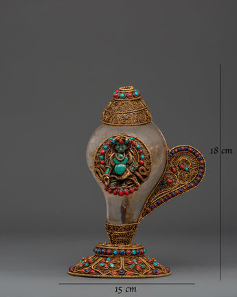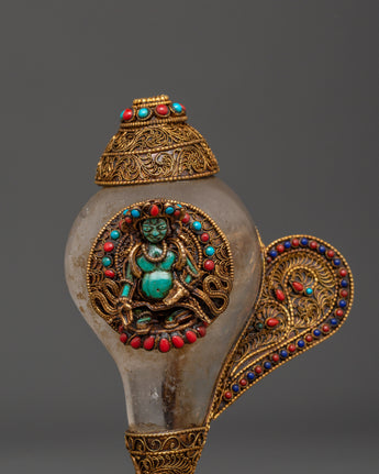 This stunning Filigree work, a Crystal Conch Shell with a Copper Body, is a finely crafted piece that combines traditional workmanship with profound spiritual significance. This conch shell, measuring 18 cm in height and 15 cm in width, is intricately carved with the image of Green Tara, the Tibetan goddess of compassion and protection, who brings positive energy and the divine feminine energy into your home. The crystal shell is securely set in a beautiful gold-plated copper body, which is embellished with delicate filigree work and colorful coral and turquoise inlays, making it an exquisite and one-of-a-kind addition to any Tibetan altar, spiritual decor collection, or meditation retreat.