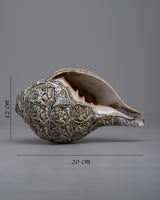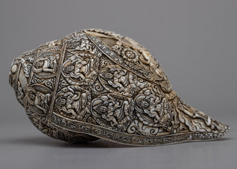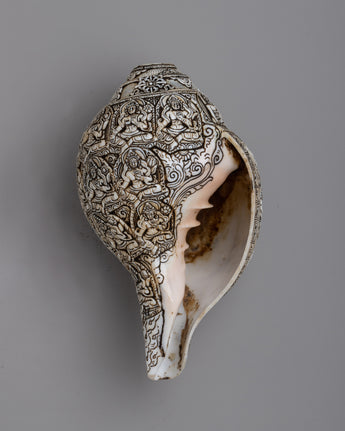 The Deities Carved Buddhist Sankha is a sacred object used in rites, ceremonies, and meditation activities, making it ideal for both spiritual practitioners and collectors. Its superb craftsmanship and divine iconography elicit devotion, reverence, and a stronger connection to the enlightened qualities represented by the venerated deities.