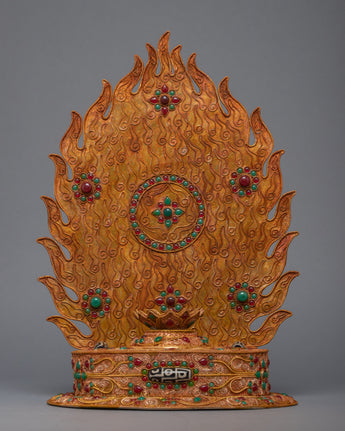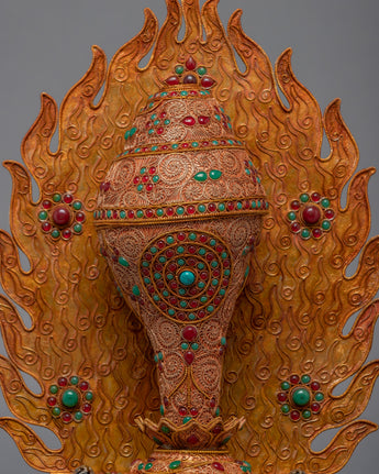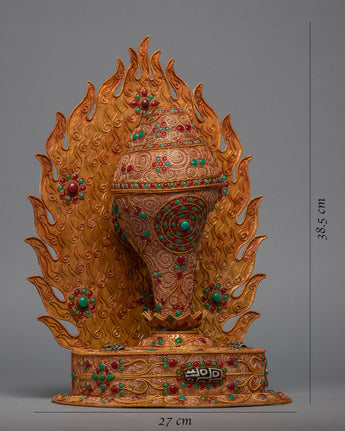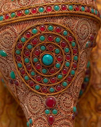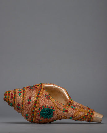 Our magnificent conch shell with filigree stand is a timeless masterpiece of traditional craftsmanship. The intricately designed filigree stand is adorned with precious stones and a stone deity, adding an element of divine presence to the piece. The conch shell has been a symbol of spirituality and the sacred for centuries, and this exquisite piece honors that tradition with its beauty and grace. A perfect addition to any spiritual or traditional home decor, this decorative shell is a true embodiment of the cultural heritage and artistic skill of the artisans. Every detail has been carefully crafted by hand, making this conch shell with filigree design a unique and valuable work of art that will be treasured for generations to come.