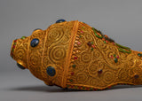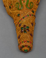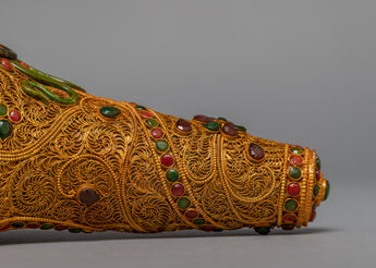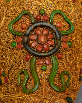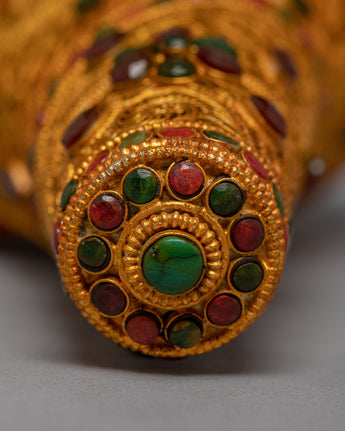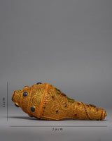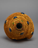 The beautiful crystal conch is made of Copper Body with 24K Gold Plating. The Gemstones are inlaid on the sankha. This exquisite item, used for offerings, is a must-have for any serious collector or dedicated Buddhist practitioner. The attention to detail and craftsmanship demonstrated in this one-of-a-kind masterpiece are astounding.
