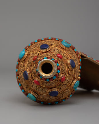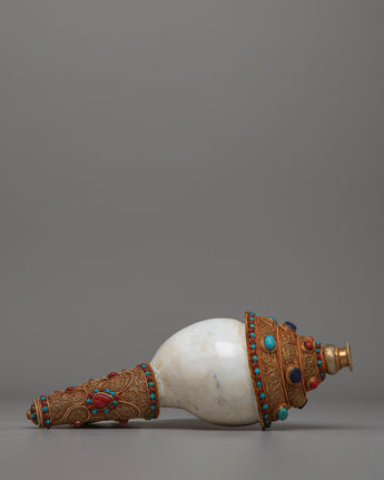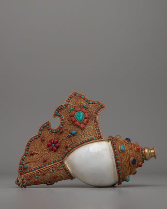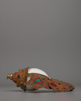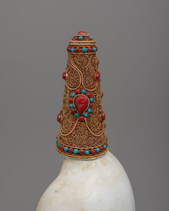 This stunning gold-plated ritual conch shell is a work of traditional Buddhist work. Its copper body is carefully decorated with beautiful filigree work and artificial stones such as coral, turquoise, and lapis lazuli. This sacred conch shell, measuring 12 cm high and 29 cm wide, serves as both a spiritual instrument and an exquisite ornamental element. It is very symbolic in Tibetan Buddhism, representing the sound of the Dharma and the adoption of wisdom and peace.
