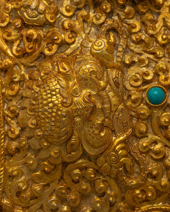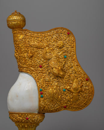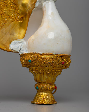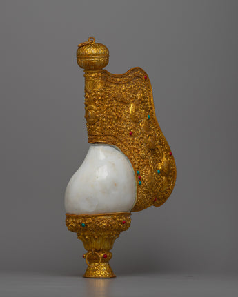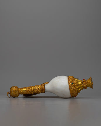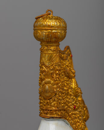 This Gold Shankha represents a blend of beauty, tradition, and spirituality, and is ideal for use in spiritual practices, as a collector's item, or as an ornamental piece. Its intricate design and luxurious materials make it a unique and valuable addition to any collection, evoking the richness of spiritual traditions as well as the elegance of handcrafted artistry.