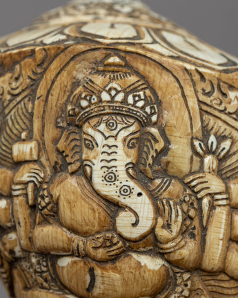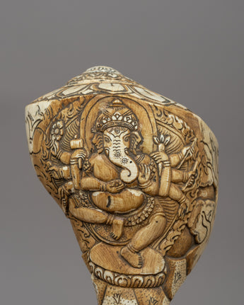 This hand-carved Sankha features a detailed depiction of Lord Ganesha, the revered elephant-headed deity of wisdom, prosperity, and obstacle elimination. Ganesha is shown in a majestic seated position, radiating divine elegance and spiritual force. His numerous arms indicate omnipotence, bearing sacred artifacts that represent intelligence, success, and protection. The intricate hand carving exemplifies great craftsmanship, making this conch a special and spiritually meaningful offering for altars, meditation places, and temple rituals. This Sankha is a powerful spiritual tool that captures the essence of holy sound and enlightenment, making it ideal for pujas, Buddhist ceremonies, and sacred home decor.