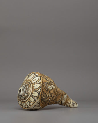 This hand-carved conch shell (Sankha), which is 12cm in height and 21cm in width, is a sacred ritual instrument with roots in Buddhist and Hindu traditions. Weighing 0.37kg, this finely sculpted conch represents power, victory, and heavenly authority. In Buddhism, the Sankha symbolizes the Buddha's speech, which spreads wisdom in all directions. In Hinduism, it is associated with divine energy and ritualistic offerings and is commonly utilized in temples and spiritual ceremonies. The resonating sound of the conch shell is thought to eliminate negativity, cleanse the environment, and welcome divine favors.