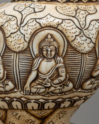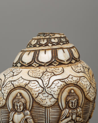 This beautiful hand-carved conch shell has deep spiritual meaning in Tibetan and Hindu traditions, making it an admired treasure. Known as the Shankha, it represents divine energy, auspiciousness, and purity. It is a remarkable item for meditation, prayer rituals, and spiritual offerings as it features the exquisitely carved images of Buddha. This conch shell, which is 10 cm tall and 20 cm wide, adds strength to any altar, shrine, or setting of meditation.