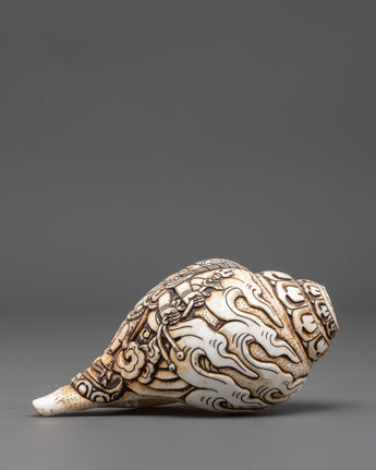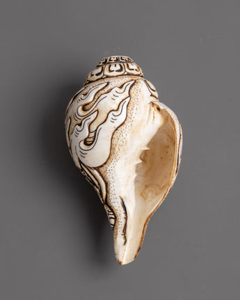 This piece is expertly created from a conch shell, with each curve and design reflecting accuracy and spiritual intent. The artisan's skill brings to life the deity's angry face and symbolic embellishments, resulting in an object that is both powerful and artistically profound. This Tibetan conch, which has traditionally been used in monasteries for ceremonies and offerings, is also a beloved altar piece thought to cleanse the environment and invite divine protection. It's more than just a ritual tool; it's a spiritual treasure that represents the power of transformation and wisdom.